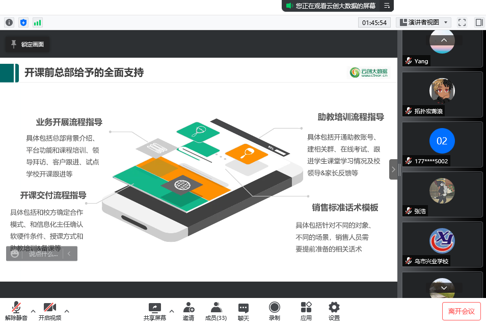 在此基礎(chǔ)上,湯鵬老師則補充介紹了云創(chuàng)青少年人工智能編程城市合伙人模式等。接著,云創(chuàng)大數(shù)據(jù)合作伙伴——拓撲宏(杭州)程總圍繞“人員分工”、“市場計劃”、“案例展示”、“企業(yè)家聚會”等重點分享了其在市場推廣方面的成功經(jīng)驗。