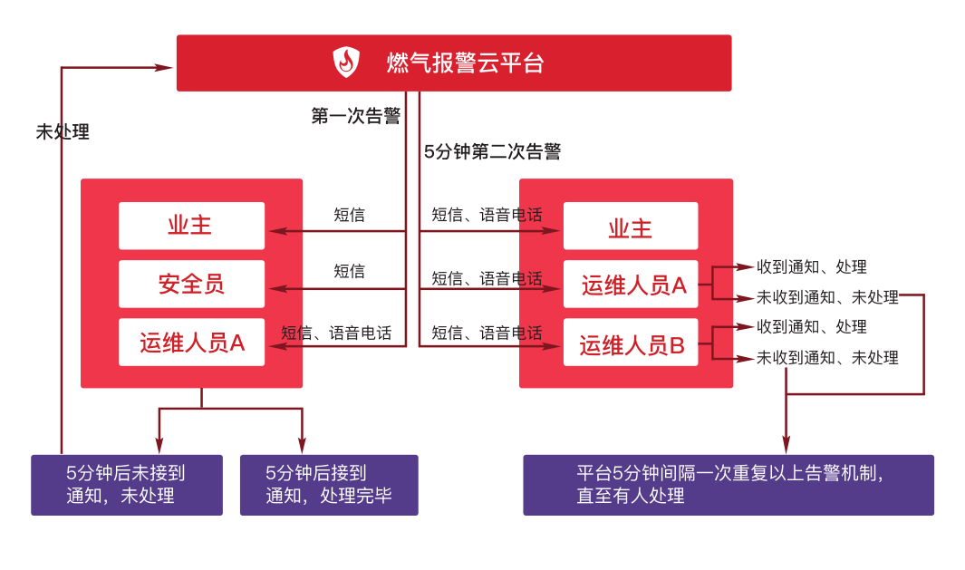 一般來說,按照報警流程,如果燃氣發(fā)生異常時,燃氣報警云平臺會及時通知業(yè)主、街道安全員以及平臺運維人員。運維人員在收到短信通知后會及時打開手機APP,查看報警日志,并對異常事件進行持續(xù)跟蹤。如果聯(lián)系不到業(yè)主,運維人員會及時前往現(xiàn)場,進行現(xiàn)場的檢測和排查。