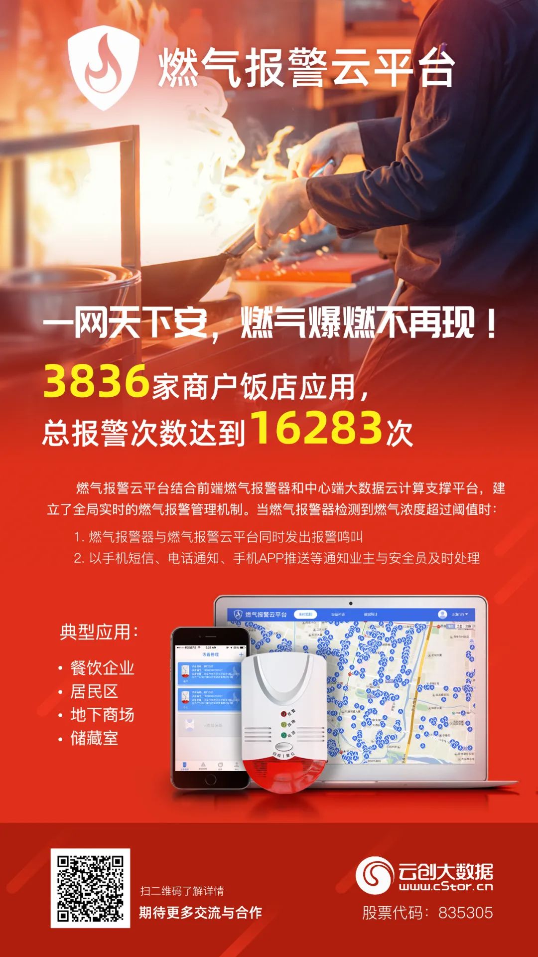 對此,云創(chuàng)大數(shù)據(jù)打造的燃氣報警云平臺,結(jié)合燃氣報警傳感器與云技術(shù)監(jiān)測系統(tǒng),構(gòu)建前端燃氣報警器和中心端大數(shù)據(jù)云計算支撐平臺,建立全局實時的燃氣報警管理機制,為居民區(qū)、餐飲企業(yè)、地下商場、儲藏室等應(yīng)用場所提供預(yù)測預(yù)警、技術(shù)支撐、輔助決策等應(yīng)用服務(wù),進而減少乃至避免燃氣爆炸事故。