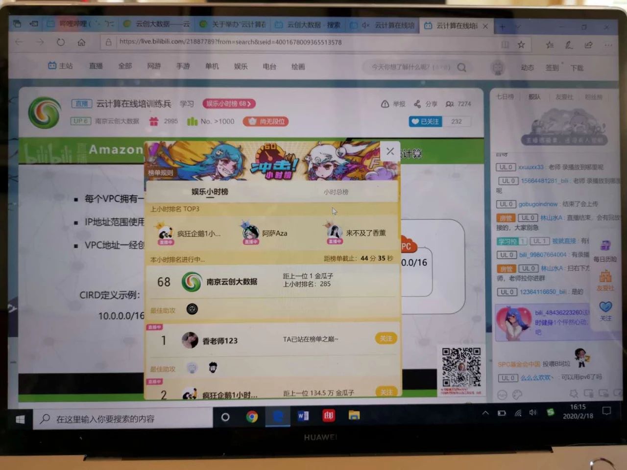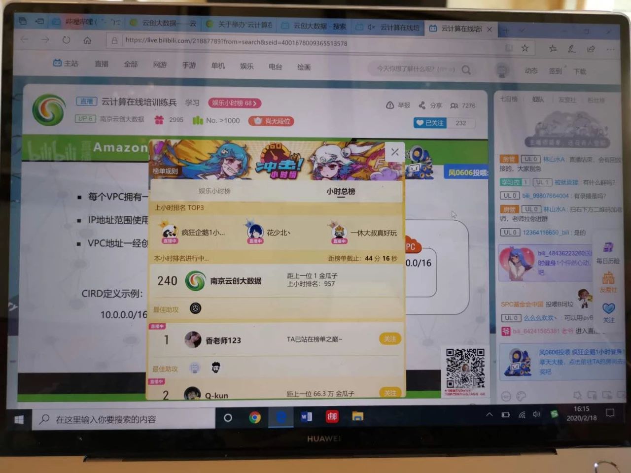 2月17日,由云創(chuàng)大數(shù)據(jù)主辦的“云計(jì)算在線培訓(xùn)練兵”通知一經(jīng)發(fā)出,即得到了熱烈響應(yīng),短短1天時(shí)間內(nèi)3場練兵報(bào)名均已滿額。18日,在剛剛結(jié)束的“云計(jì)算技能在線培訓(xùn)”中,在線直播同時(shí)在線人數(shù)超過8000人, 達(dá)到了嗶哩嗶哩小時(shí)總榜的240名和娛樂小時(shí)榜的68名。