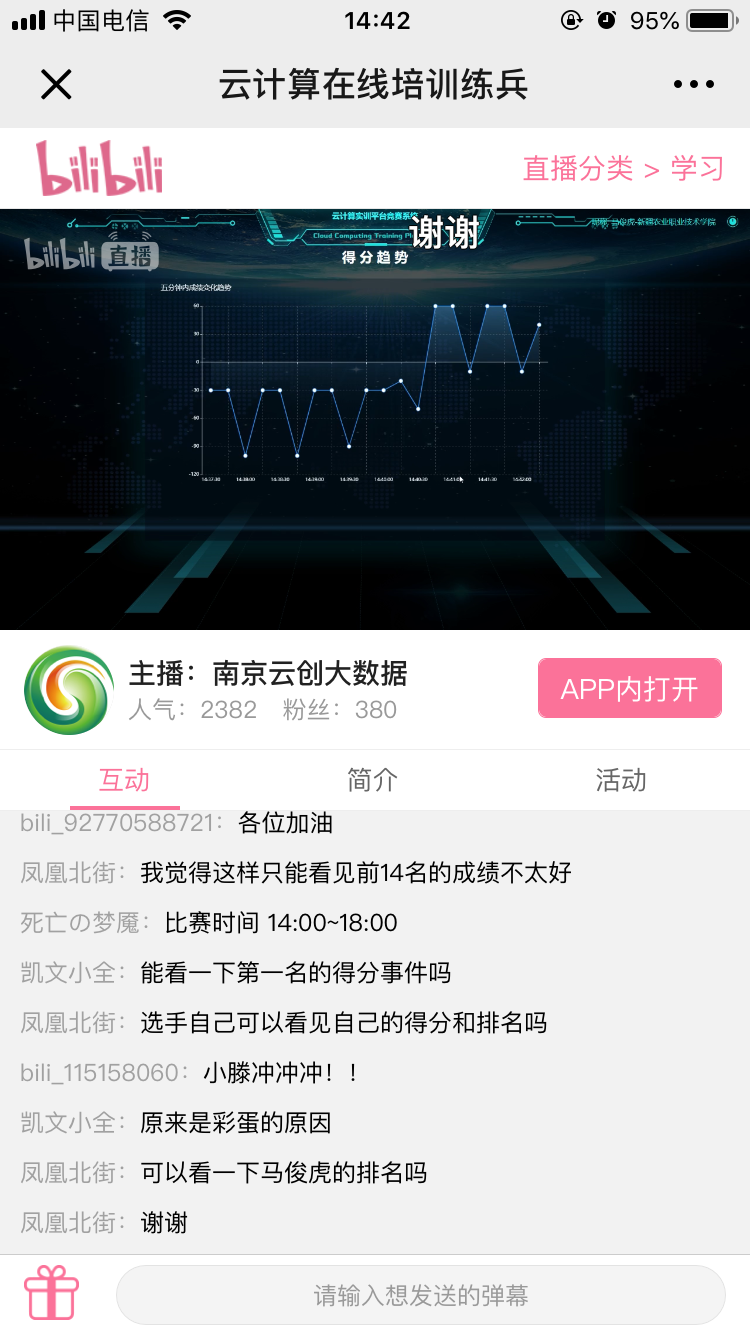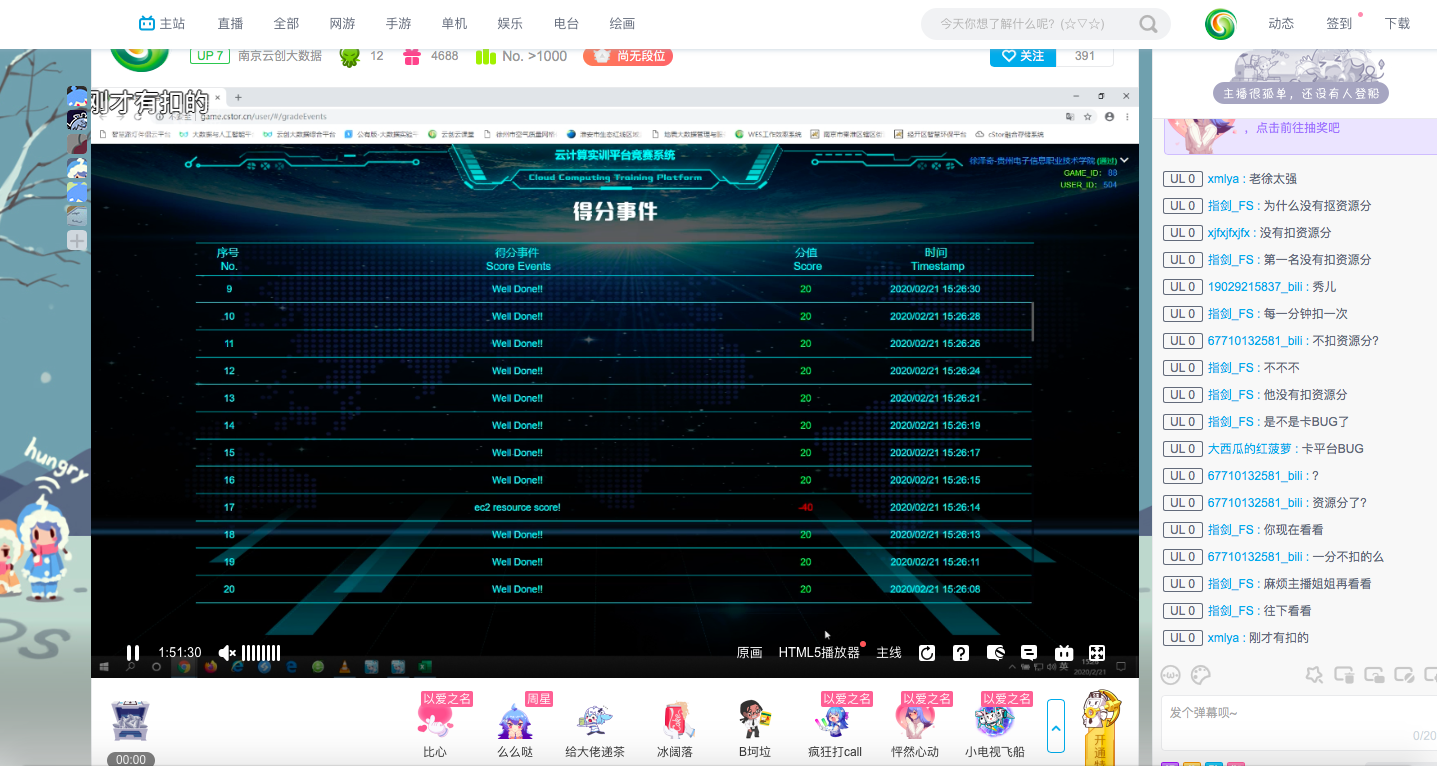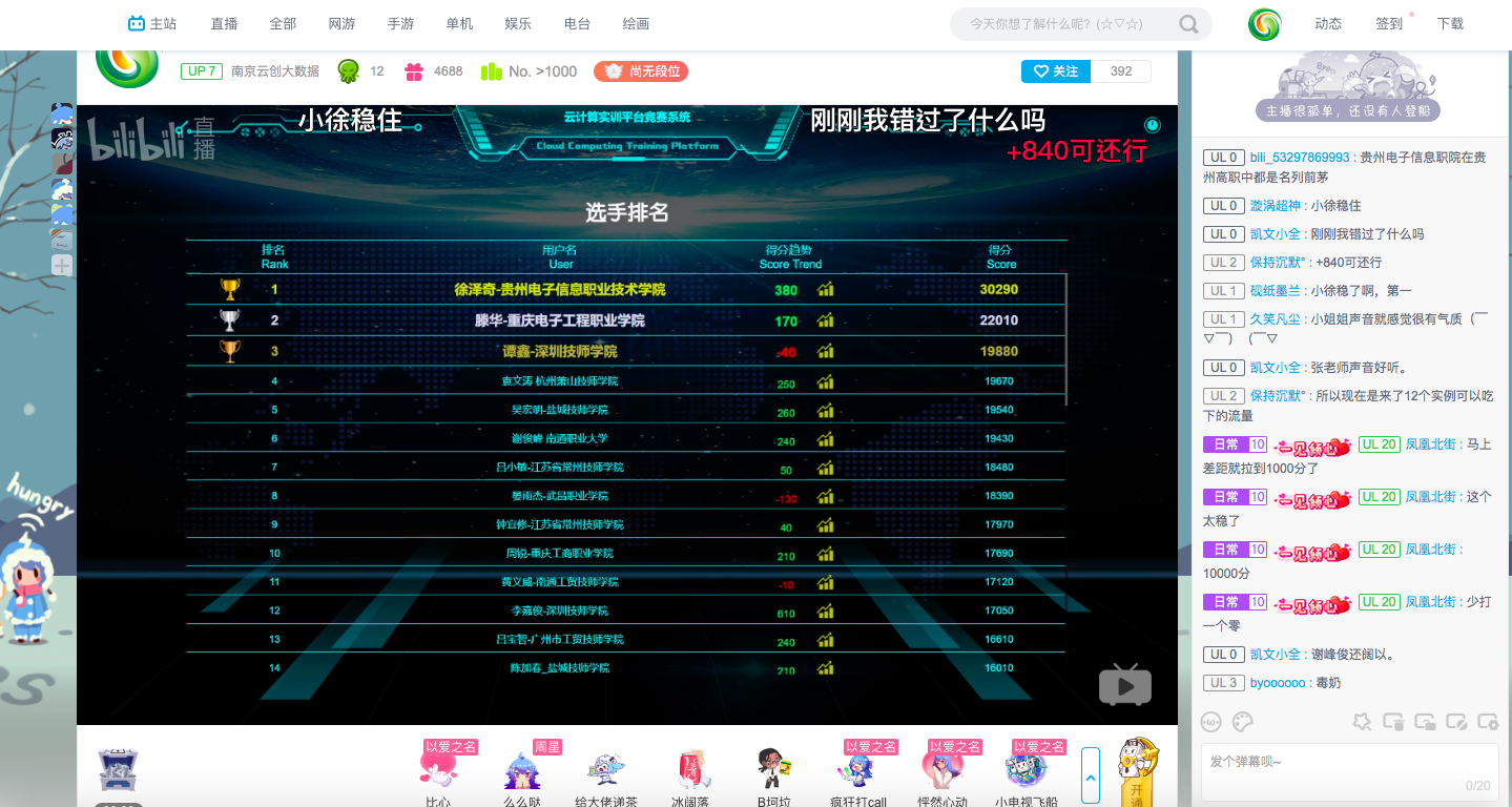 15點(diǎn)、16點(diǎn)、17點(diǎn),在比賽進(jìn)行的每一個(gè)整點(diǎn)時(shí)刻,講師針對(duì)選手實(shí)時(shí)排名情況,與大家進(jìn)行了分享。在比賽過程中,選手的得分在直播畫面上得以展現(xiàn),包括得分趨勢(shì)、得分事件,以及失分點(diǎn)和得分點(diǎn),講師都進(jìn)行了詳盡的講解,不難看出云創(chuàng)講師扎實(shí)的專業(yè)功底和不俗的講解能力。