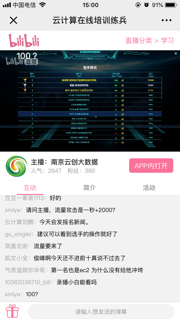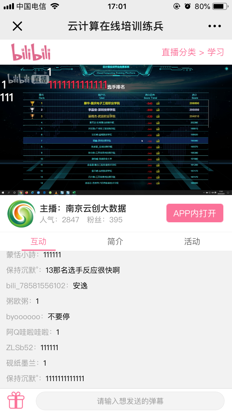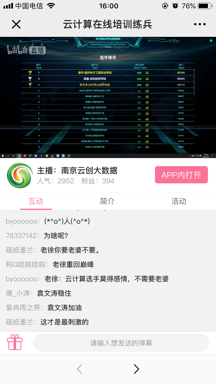 比賽激烈,互動(dòng)熱烈,排名緊張刺激……2月21日14點(diǎn)至18點(diǎn),“云計(jì)算技能第三次在線練兵”直播互動(dòng)在嗶哩嗶哩和大家如約見面。與前兩次練兵一樣,本次練兵再度展現(xiàn)了參賽選手優(yōu)秀的云計(jì)算實(shí)戰(zhàn)能力。