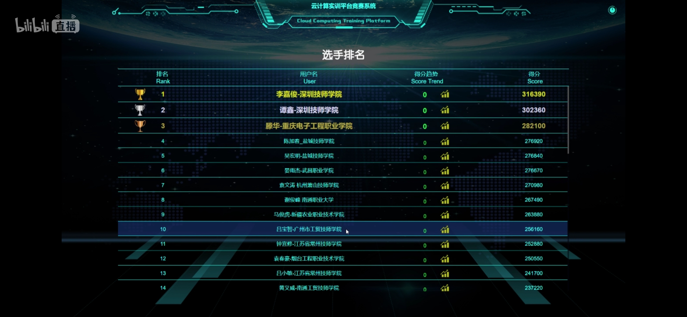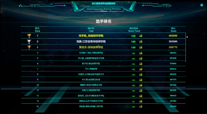 在比賽后半段,選手排名一度成為講師與大家討論的熱議話題,大家爭(zhēng)相對(duì)選手的最終排名進(jìn)行預(yù)測(cè)。18點(diǎn),第三次練兵選手最終排名公布,懸念得以揭曉,深圳技師學(xué)院的選手勇奪頭籌。截止當(dāng)前,前三次“云計(jì)算技能在線練兵”最終排名全部公布,具體排名如下: