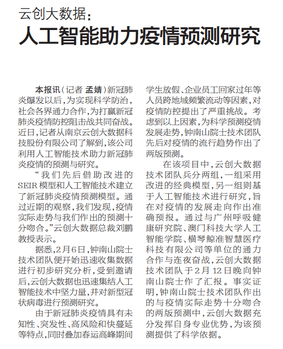 3月25日,《江蘇科技報》A5要聞版《云創(chuàng)大數(shù)據(jù):人工智能助力疫情預(yù)測研究》,對云創(chuàng)大數(shù)據(jù)參與鐘南山技術(shù)團隊,與多家醫(yī)科院校、醫(yī)療企業(yè)開展合作,對新冠肺炎疫情走勢進行科學(xué)預(yù)測進行了報道,并對預(yù)測方法、合作細節(jié),以及研究成果等進行了介紹。
