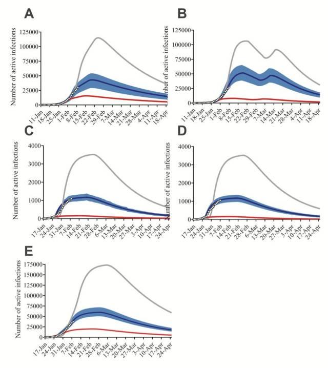?。ˋ)湖北省有嚴格管控,(B)湖北省減少管控力度,(C)廣東省,(D)浙江省和(E)中國在1月23日(藍色),5天后(灰色)和5天前(紅色)采取干預(yù)措施時的流行曲線,把每天現(xiàn)存確診病例的實際數(shù)據(jù)被擬合到曲線(圓圈)上