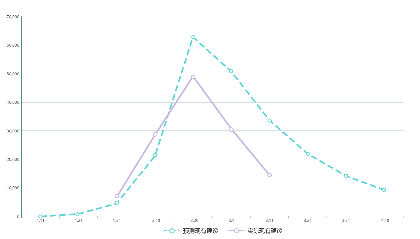 湖北感染人數(shù)預(yù)測趨勢與實際趨勢對比