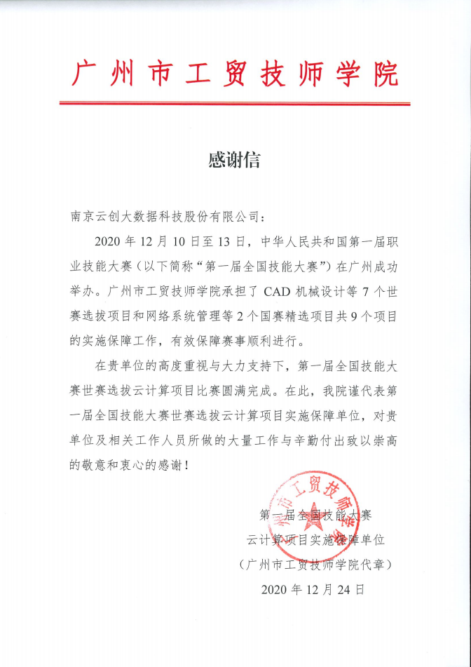 12月24日,平安夜之際,云創(chuàng)大數(shù)據(jù)收到一封特別的感謝信,這封信來(lái)自第一屆全國(guó)技能大賽世賽選拔云計(jì)算項(xiàng)目實(shí)施保障單位——廣州市工貿(mào)技師學(xué)院。該信件對(duì)云創(chuàng)及云創(chuàng)技術(shù)保障團(tuán)隊(duì)在云計(jì)算賽項(xiàng)中所做的大量工作與辛勤付出表達(dá)了敬意和感謝。